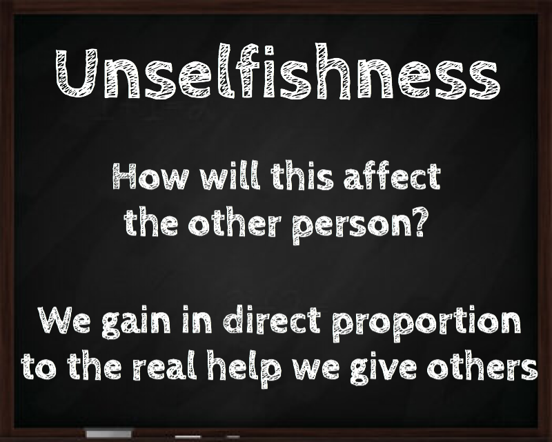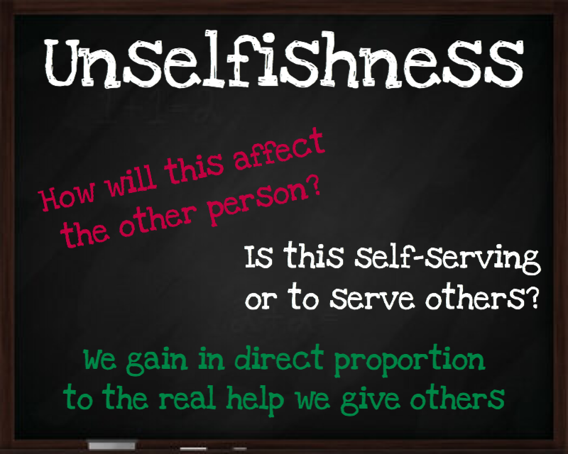 Our homework for this week is to consider and write on: “What does it look like in your life when you are absolutely Unselfishness? Write out a vision for yourself….”