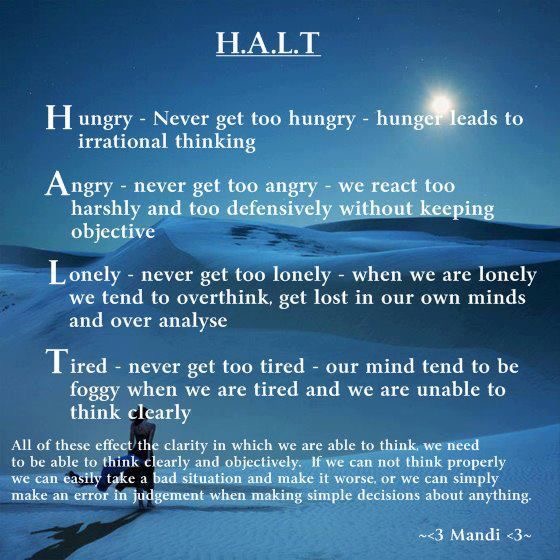 I like to use the acronym HALT: Hungry, Angry, Lonely Tired for relapse prevention.