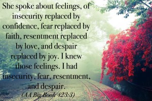 “She spoke about feelings, of insecurity replaced by confidence, fear replaced by faith, resentment replaced by love, and despair replaced by joy. I knew those feelings. I had insecurity, fear, resentment, and despair. I could not believe it. Here was a person who was happy. It seemed like a long time since I had seen one of those.”