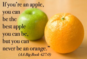“After the meeting, people welcomed me with open arms and gave me their telephone numbers. The discussion meeting was followed by a speaker meeting, where I had my first awakening in A.A. The speaker said, “If you’re an apple, you can be the best apple you can be, but you can never be an orange.” I was an apple all right, and for the first time I understood that I had spent my life trying to be an orange. I looked around at a room filled with apples and, if I was understanding the speaker, most of them were no longer trying to be oranges.”