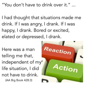 “When I had finished talking, he told me something simple: “You don’t have to drink over it.” What an idea! I had thought that situations made me drink. If I was angry, I drank. If I was happy, I drank. Bored or excited, elated or depressed, I drank. Here was a man telling me that, independent of my life situation, I did not have to drink. If I stuck with A.A., I could stay sober under any and all conditions. He gave me hope, and in many ways, he symbolized the door through which I finally walked into Alcoholics Anonymous.”
