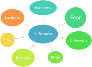 62:1  Selfishness – self-centeredness! That, I think, is the root of MY troubles. Driven by a hundred forms of fear, self-delusion, self-seeking, and self-pity, I step on the toes of MY fellows and they retaliate. Sometimes they hurt ME, seemingly, without provocation, but I invariably find that at some time in the past I have made decisions based on self, which later placed ME in a position to be hurt.