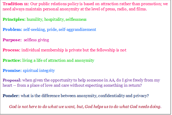 Tradition 11 Short Form: Our public relations policy is based on attraction rather than promotion; we need always maintain personal anonymity at the level of press, radio, and films.