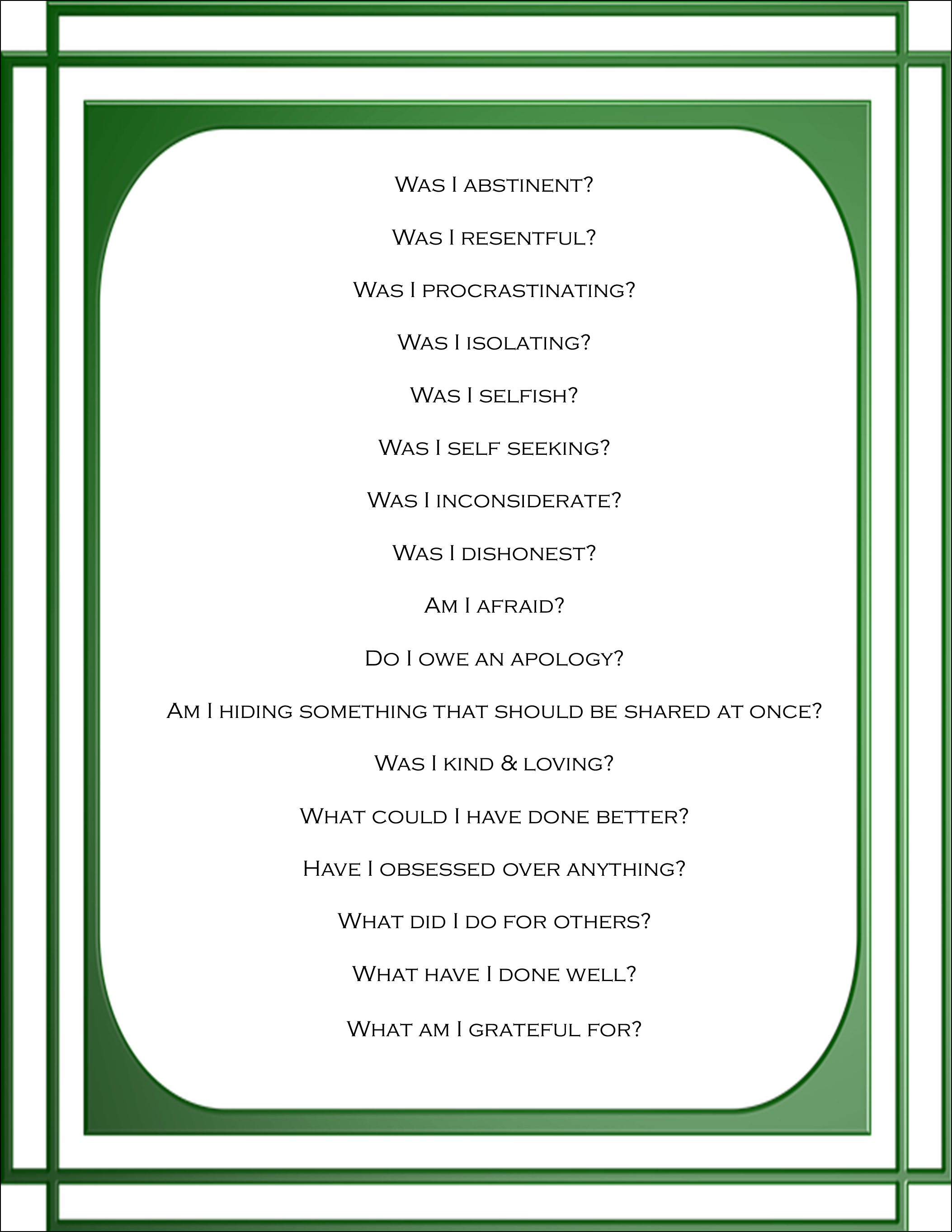 Today, I was on a meeting, and someone shared this inventory. It adds a few different ideas than I have posted in the past. I am hoping will help me gain more insight and improve my conscious contact with God, as I understand Him.