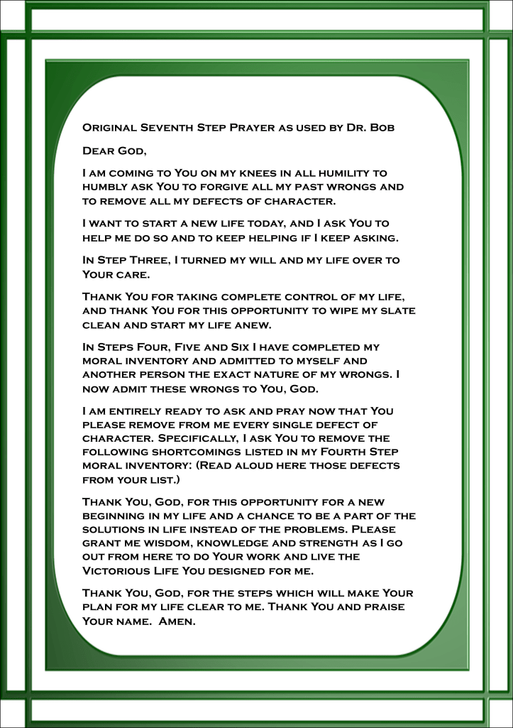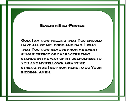 When ready, we say something like this: “My Creator, I am now willing that you should have all of me, good and bad. I pray that you now remove from me every single defect of character which stands in the way of my usefulness to you and my fellows. Grant me strength, as I go out from here, to do your bidding. Amen.” We have then completed Step Seven.