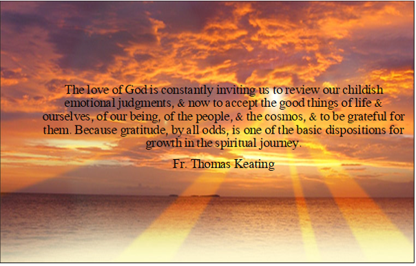 The love of God is constantly inviting us to review our childish emotional judgments, & now to accept the good things of life & ourselves, of our being, of the people, & the cosmos, & to be grateful for them. Because gratitude, by all odds, is one of the basic dispositions for growth in the spiritual journey.