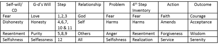 I also made this chart comparing the 4 Absolutes with the 4 Character Defects as outlined in the AA Big Book and the Serenity Prayer.