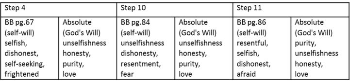 Consequently, the 4 Absolutes are only referred to indirectly in their opposite self-will form in the AA Big Book. Rather than focusing on honesty, unselfishness, purity and love, the AA Big Book, asks us to examine where self-will fails us: where were we selfishness, self-seeking, dishonesty and afraid?