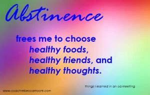 There is a wealth of information available online on abstinence and following a food plan. The links to OA are always being changed or broken. Therefore, if you are interested in seeing any information from OA on abstinence, please go to their website and contact them directly. Please look for their Strong Abstinence Checklist.